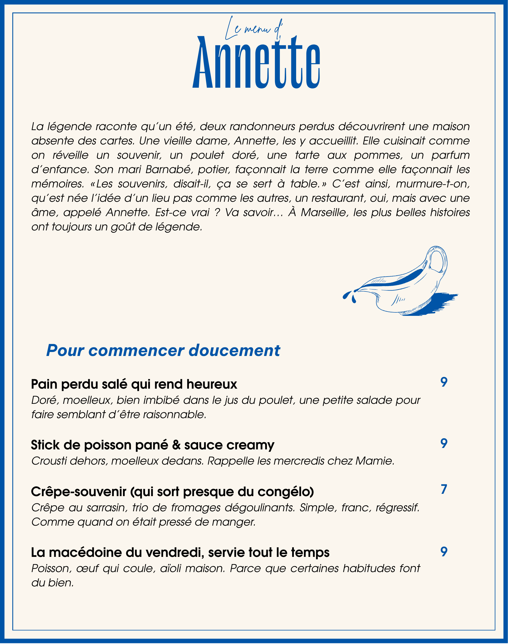Ici, on fait revivre les goûts d’hier avec l’œil et la main d’aujourd’hui.Des plats inspirés des souvenirs de grand-mère, des fêtes foraines et des goûters d’enfance — revisités, détournés, parfois un peu coquins.On joue avec la nostalgie, on twiste les classiques, on mélange douceur et audace.Une cuisine régressive, sincère et joyeuse… à déguster sans souci.